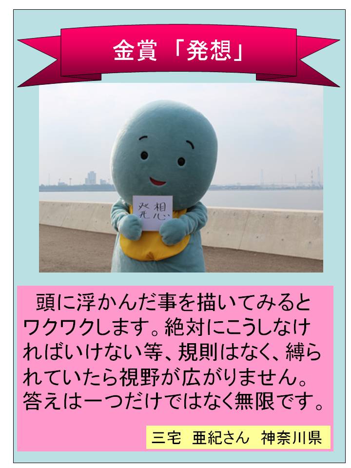・とてもステキな”発想”だと思いました。意外と日々の生活の中で、自分の考えで縛られてしまっているところも あるので、もっと答えを、無限に! 無限に! 発想していきたいと思う作品でした。